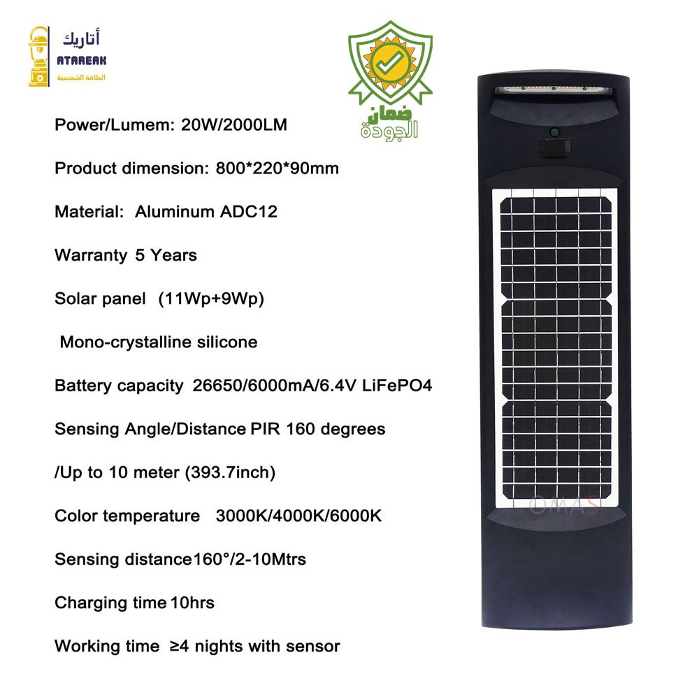 مزودًا بخلية ضوئية متطورة تستقبل أشعة الشمس من الفجر حتى الغسق ويمكن تشغيلها تلقائيًا عند المغرب حتى الفجر ، دون الحاجة إلى التشغيل يدويًا ،مما يوفر الوقت والجهد.