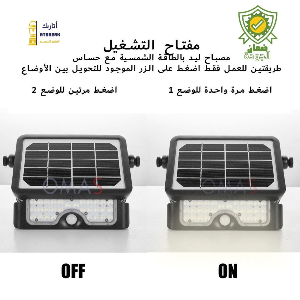 الوضع أ: يعمل المصباح تلقائياً من الفجر وحتى الغروب بنسبة إضاءة 50% وعند اكتشاف أي حركة سيتم تشغيل الإضاءة بنسبة 100% . وعند وصول شحن البطارية إلى أقل من 30% سيتم التحويل تلقائياً إلى الوضع ب.
