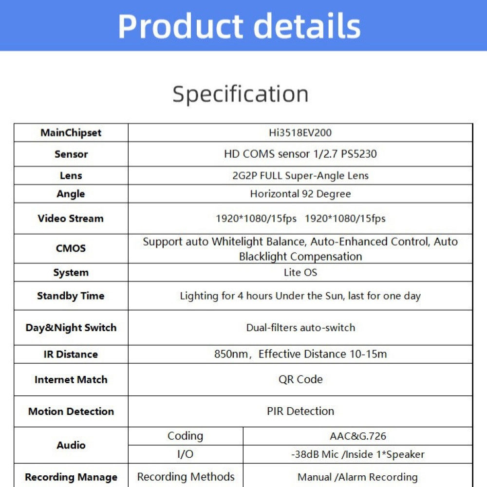 - 120 درجة زاوية عرض واسعة: تتميز كاميرا المراقبة الشمسية بزاوية عرض واسعة تبلغ 120 درجة، للعرض الواسع وعرض المزيد من المحتوى.